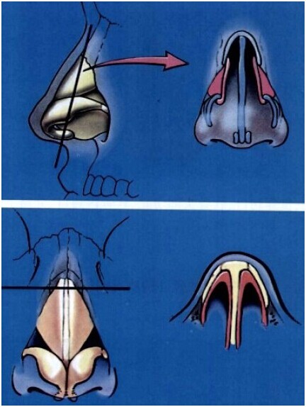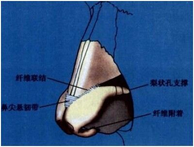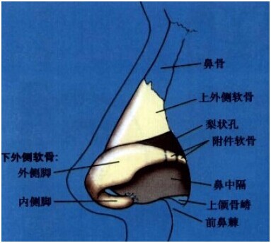 鼻背分为软骨顶部和骨顶部。软骨顶部由侧鼻软骨和鼻中隔软骨构成的。能否正确认识侧鼻软骨和鼻翼软骨的解剖学结构,决定着鼻整形手术的成败。侧鼻软骨从前面看是三角形,与鼻骨紧密接合在一起,所以把这个部位称之为鼻礁石,它以侧鼻软骨、鼻骨、鼻中隔的软骨部分及筛骨的垂直板等构成。