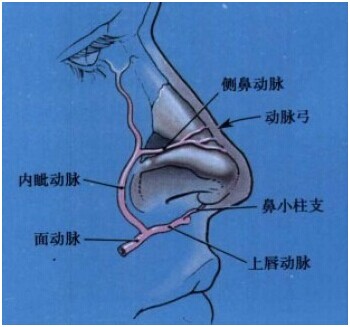 鼻尖的血液供给,受突出的鼻子解剖学特征的限制。经研究发现,鼻尖部血管的血液供给分为四种类型:①从侧动脉接受血液供经;②从鼻背动脉接受血液供给;③从对侧鼻动脉接受血液供给;④从对面鼻北动脉接受血液供给。鼻尖血液的供给主要来源是侧鼻动脉和鼻背动脉,一部分通过鼻北分支供给。侧鼻动脉和鼻背动脉通过筋膜层或薄脂肪层分布于鼻尖。这个动脉经过支撑鼻尖形态的鼻翼软骨的顶部,最接近于软骨,手术剥离时要注意这个部位。